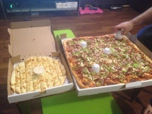 We will eat pizza for at least a week but now I can say that I have ordered one huge pizza and it arrived in a cardboard box wrapped in a throw!