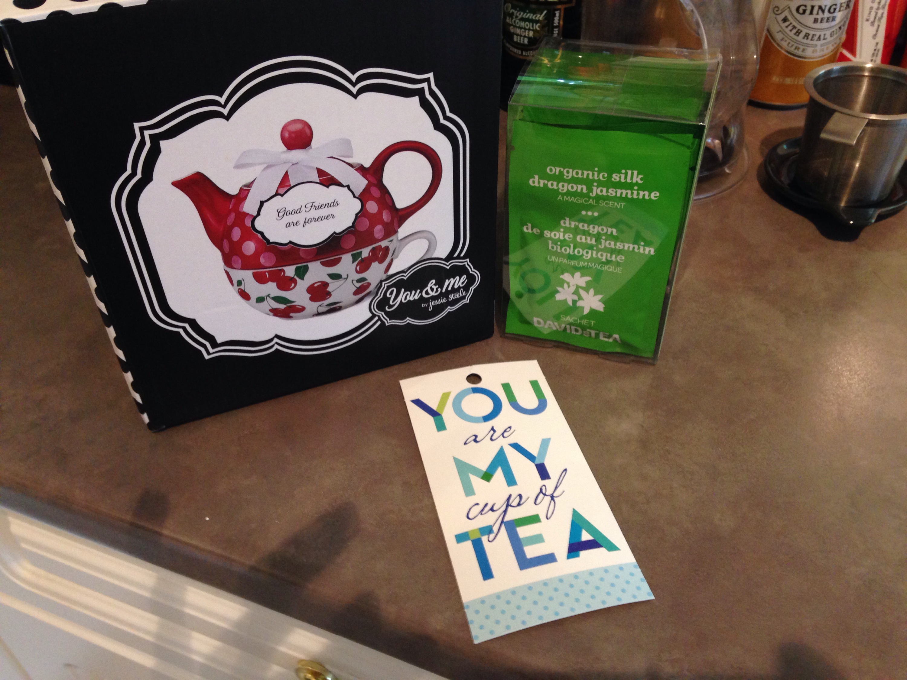 A perfect tea pot for one and organic silk dragon jasmine tea from David’s tea. Emily loves jasmine tea and Barb obviously listens to Emily’s stories because she bought this without asking us for Emily’s favorite kind of tea.