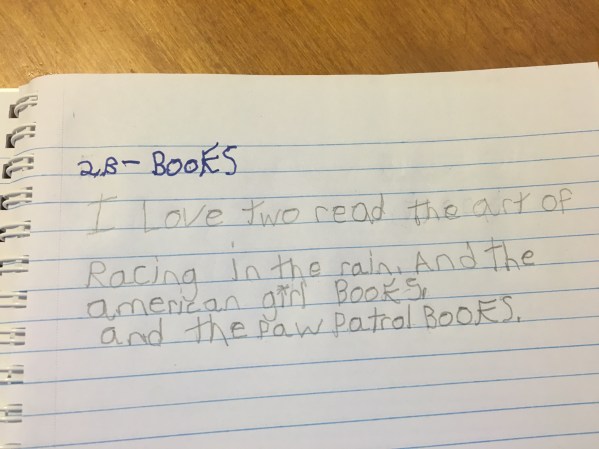 ” I love two read the art of racing in the rain. And the American girl books. and the paw patrol books.”