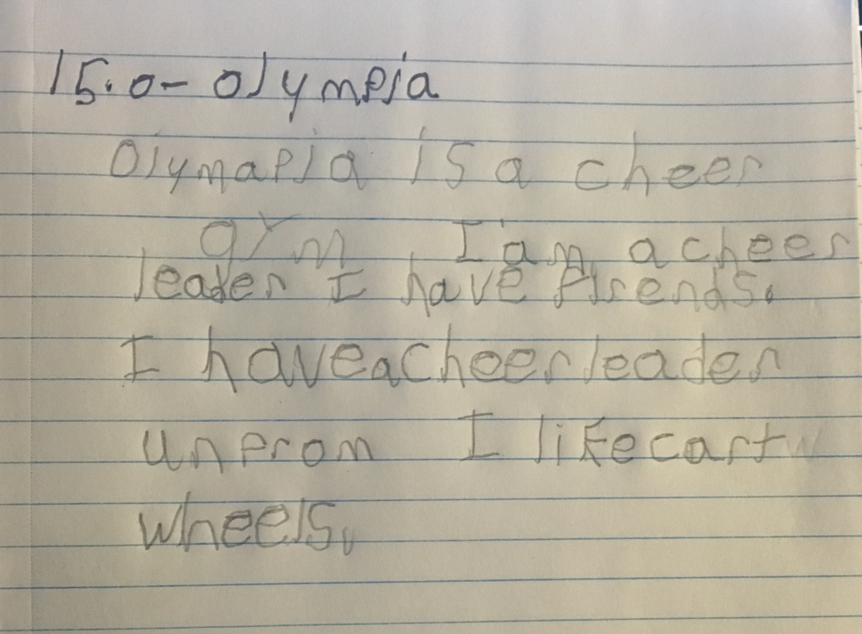 Olympia is a cheer gym.  I am a cheer leader.  I have friends.  I have a cheerleader uniform.  I like cart wheels.